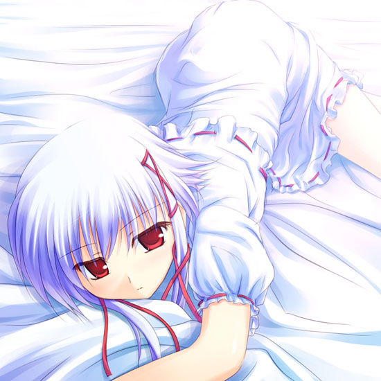 00s1girlbed sheetblue hairfemale focushair ribbonpajamasred eyesribbonribbon trimribbon-trimmed clothesribbon-trimmed sleevesshort sleevessolowhite hair