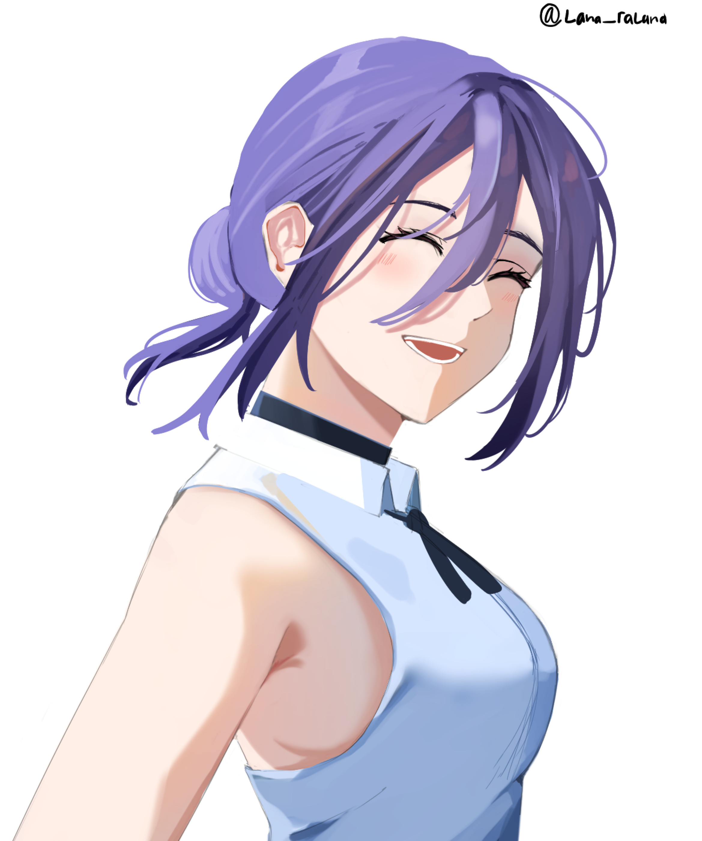 1girlblack chokerblack ribbonbreastschokerclosed eyescollared shirthair bunmedium breastsneck ribbonopen mouthpurple hairribbonshirtsimple backgroundsleevelesssleeveless shirtsmilesoloteethtwitter usernamewhite backgroundwhite shirt