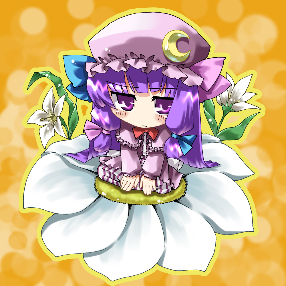 1girlblushchibicrescent hat ornamentfemale focusflowerhathat ornamentlong hairpurple eyespurple hairsolo