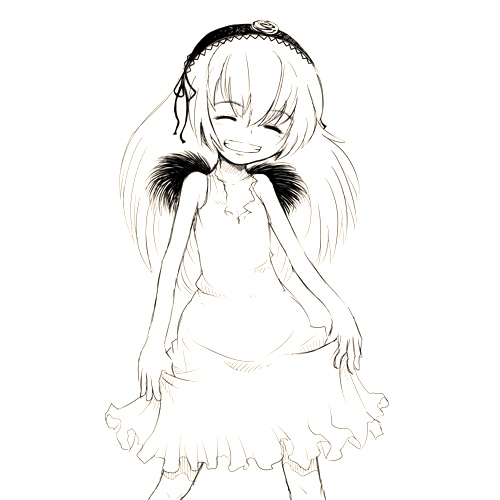 00schildclosed eyesclothes liftdressdress liftflat chestgreyscalegrinhairbandlong hairmonochromeskirt holdsmilesolowings
