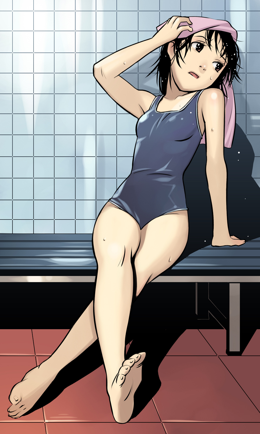 1girlbarefootblack haircrossed legsfeetfemale focusflat chestfull bodylegsone-piece swimsuitschool swimsuitsittingsoloswimsuittowelwet