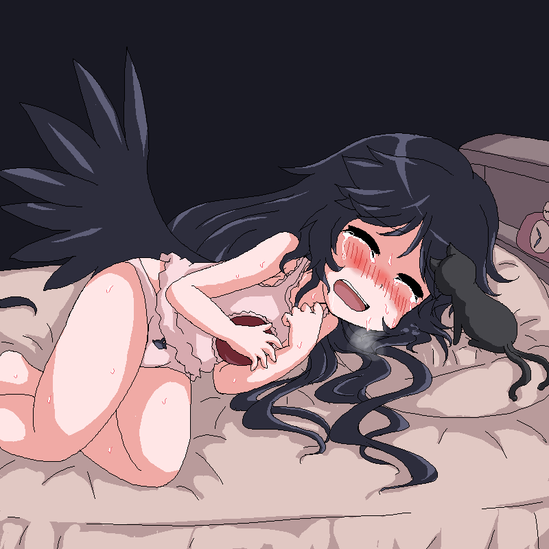 1girlblack hairblushcatfemale focusgrey backgroundhair spread outlong hairmultiple tailspantiessimple backgroundsolotailtearstwo tailsunderwearwings