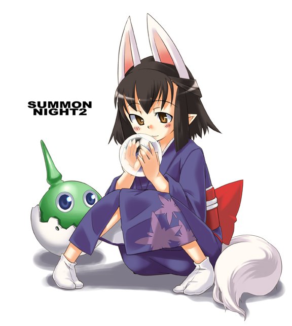 animal earsblack hairblushbrown eyesbrown hairjapanese clotheskimonopointy earsrabbit earsshort hairsittingsmilesockssolotabitail