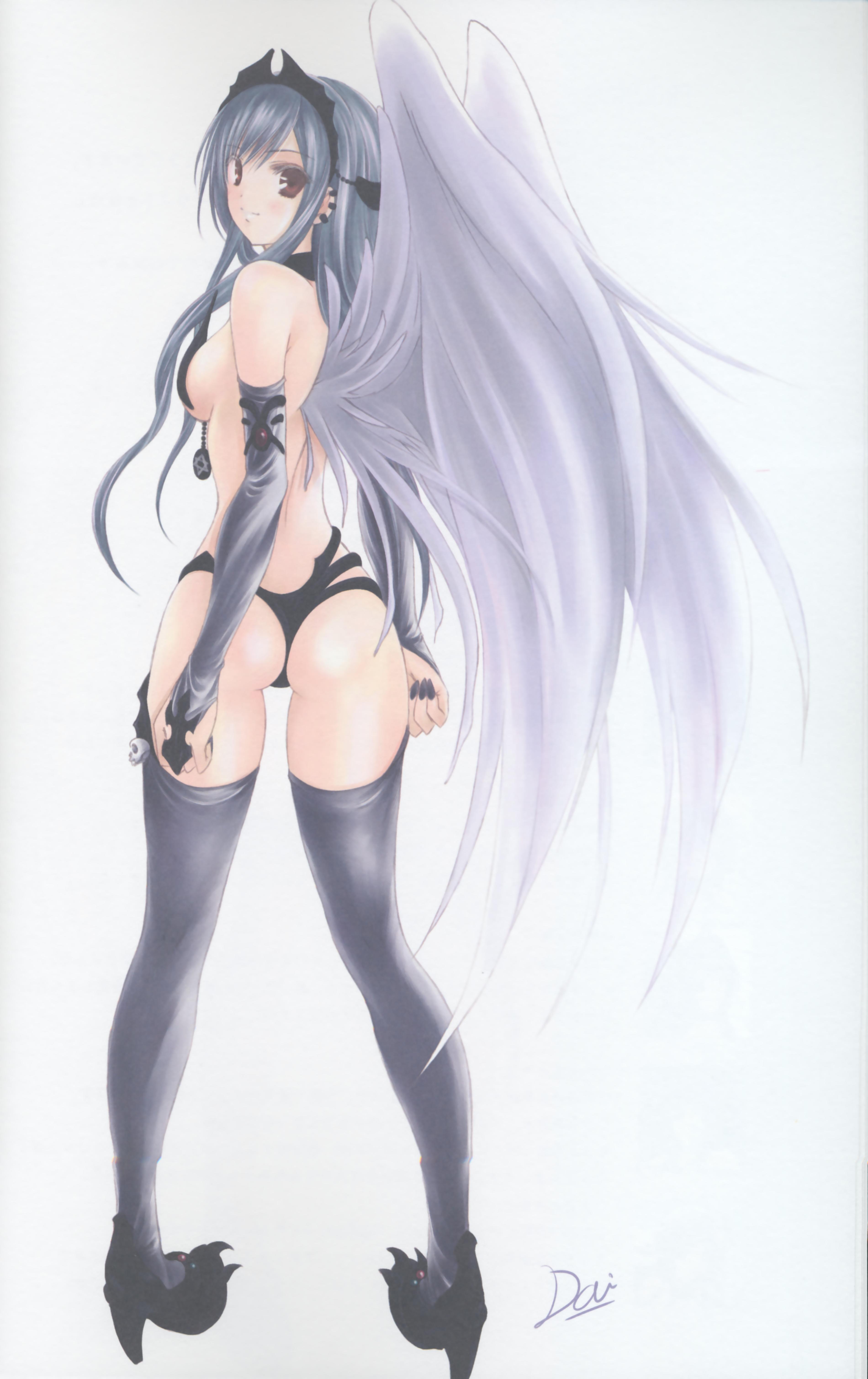 1girlassblue hairbreastsbrown eyeselbow glovesfemale focusgloveshairbandhigh heelslong hairlooking backpantiesshoessideboobsmall breastssolothighhighsthongunderwearwings