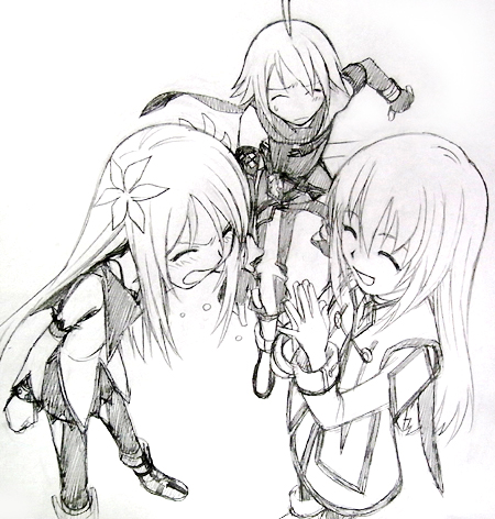 aura (sousou no frieren), frieren, sousou no frieren, twitter, 2girls, chibi, cooking, demon girl, dress, grey hair, horns, japanese text, multiple girls, pointy ears, purple hair, simple background, twintails, upper body, white background