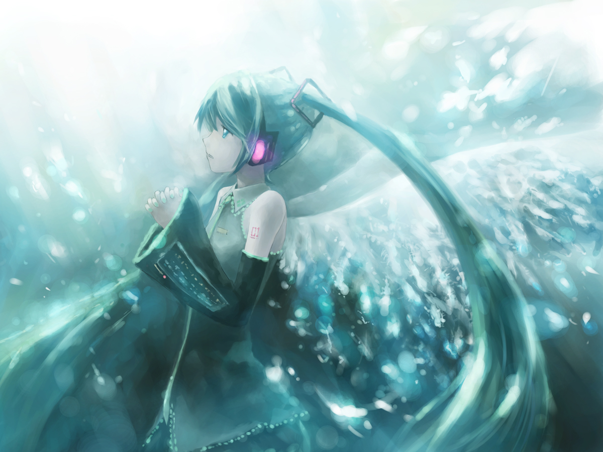 aqua eyesaqua hairdetached sleeveslong hairown hands claspedown hands togethersolotwintailswings