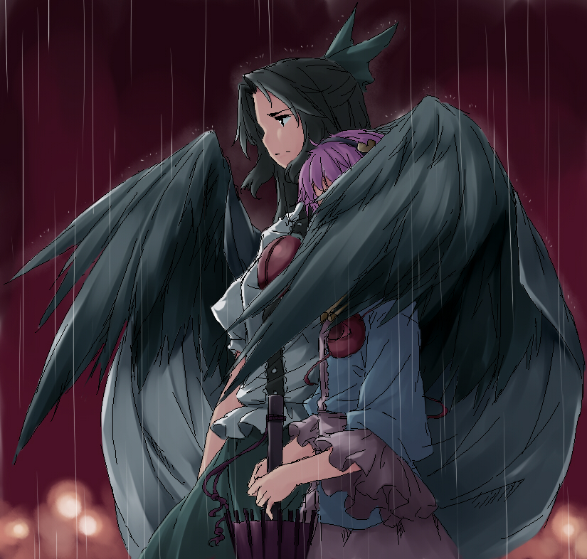 2girlsblack hairblack wingsfeathersfemale focusmultiple girlspurple hairrainshort sleevesskirtwing hugwings