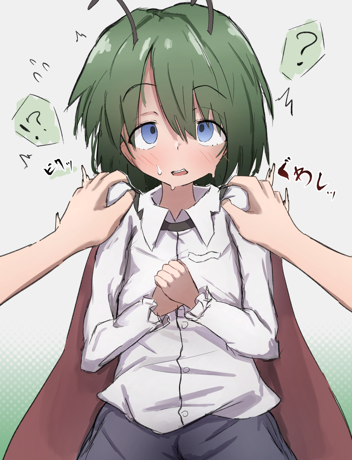 1boy1girl1otherantennaeblack shortsblue eyesblushcapecollared shirtcowboy shotgreen hairgrey backgroundhands on another's shoulderslong sleeveslooking at vieweropen mouthpovpov handsred capeshirtshort hairshortssolo focuswhite shirt