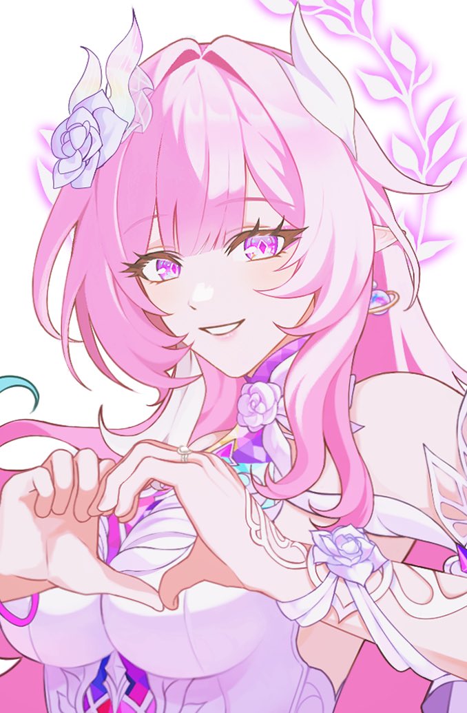 1girlbare shouldersbreastsearringselfflowerhair flowerhair ornamenthaloheartheart handsjewelrylarge breastslong hairlooking at viewermulticolored hairpink hairpointy earspurple eyessimple backgroundsmilesolotwo-tone hairupper bodyvery long hairwhite backgroundwhite hair
