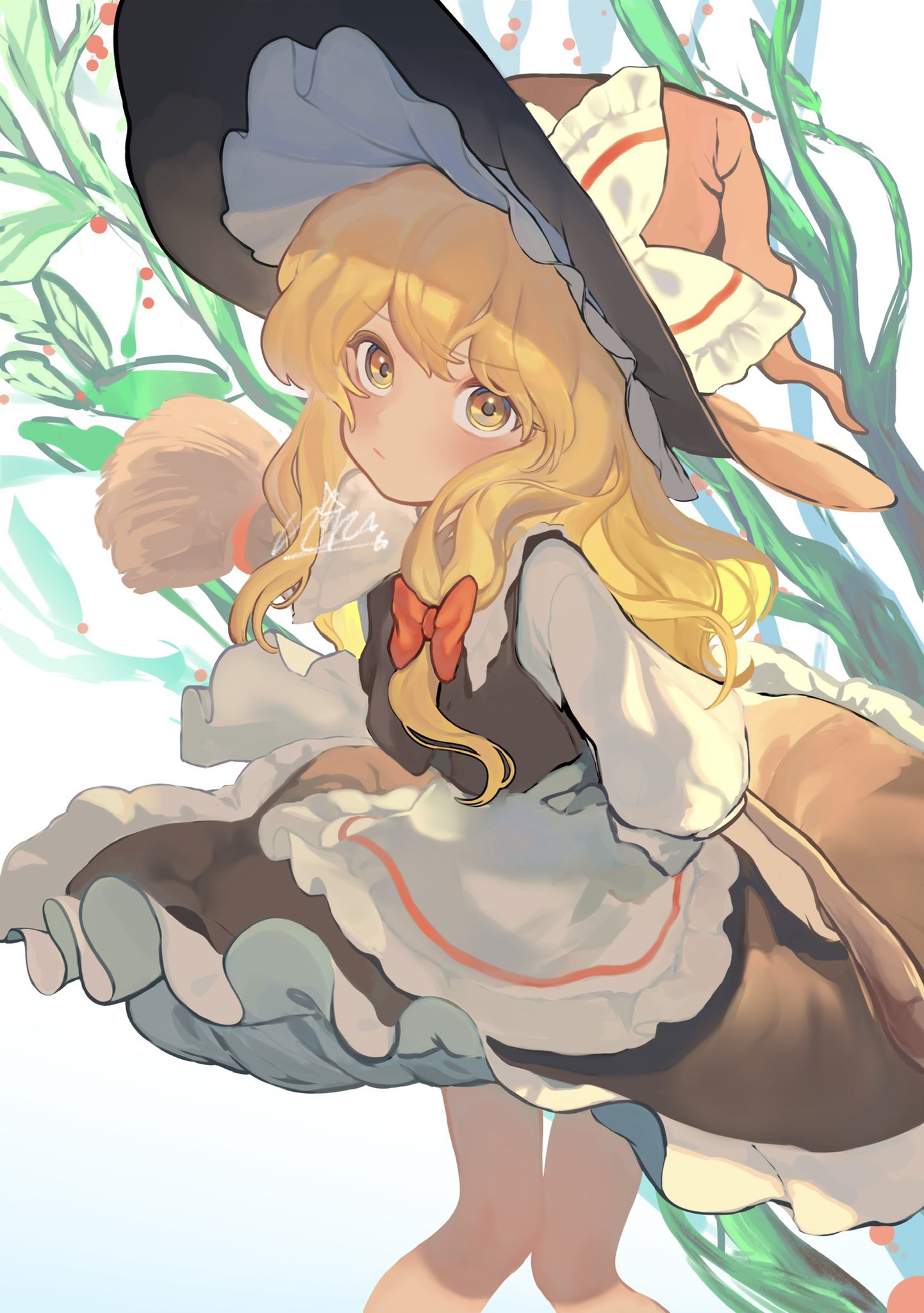 1girlapronblack vestblonde hairblushbowbraidbroomdouble-parted bangsdressfrilled bowfrilled hatfrillshair bowhathat bowknees together feet apartlong hairlooking at viewerplantred bowsingle braidskirtskirt setsolovestwaist apronwhite apronwitch hatyellow eyes