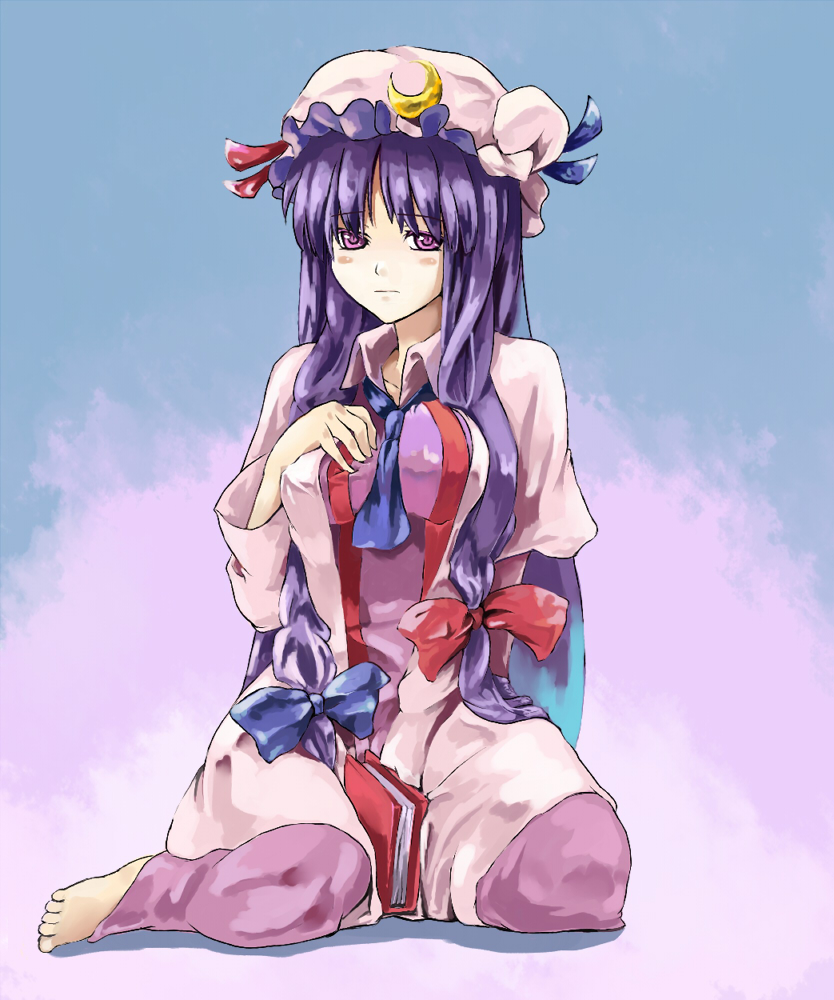 1girlbarefootblushbowcrescentcrescent hat ornamentcrescent moonfemale focushair bowhathat ornamentlong hairmoonnecktiepurple eyespurple hairsittingsolosquare-end necktie