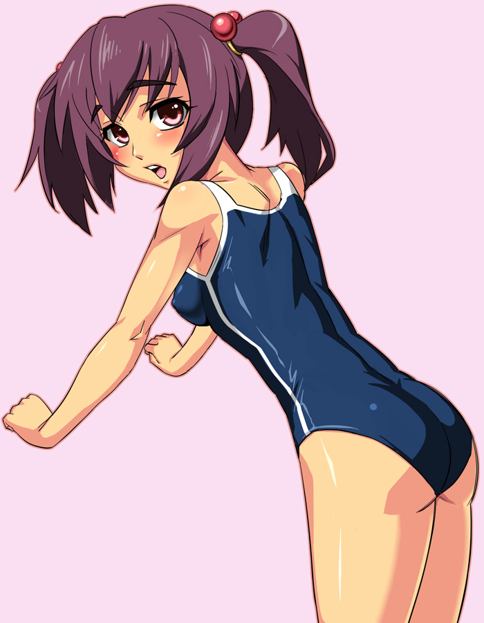 1girlbent overbrown eyesbrown hairfemale focusflat chestlooking backone-piece swimsuitschool swimsuitsoloswimsuittwintails