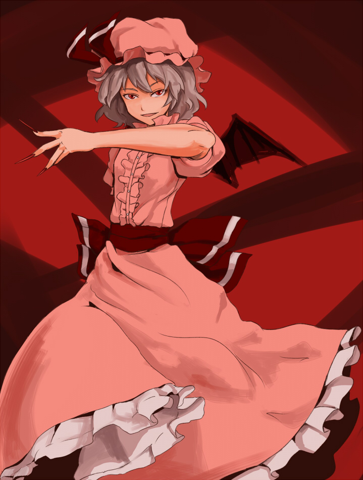 kozue, yukibina, flandre scarlet, touhou, bad id, bad pixiv id, 1girl, apple, blonde hair, fang, fangs, female focus, food, fruit, hat, mob cap, ponytail, ribbon, short hair, solo, standing, zoom layer