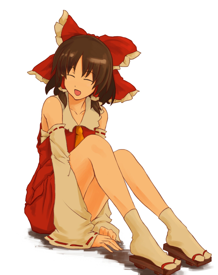 1girlclosed eyesdetached sleevesfeetfemale focusgetajapanese clotheslegsmikosimple backgroundsmilesockssolotabi