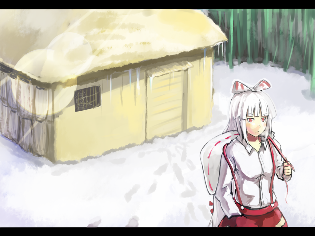 1girlblunt bangsbowbreathfemale focushair bowhouseletterboxedlong hairred eyessacksnowsolosuspenderswhite hairwinter