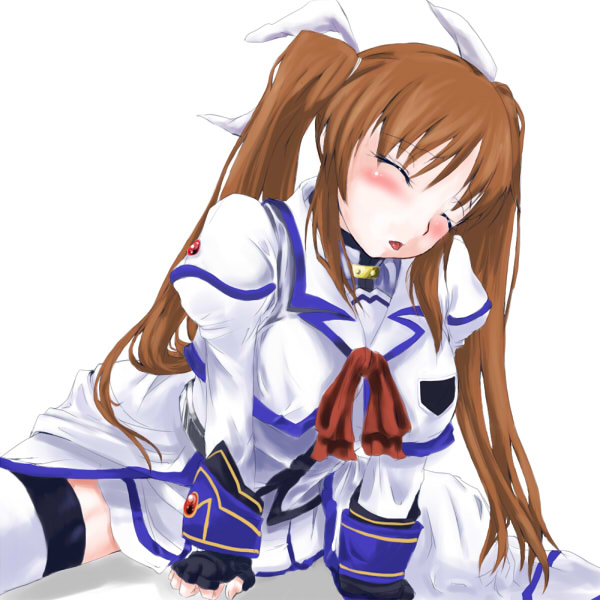 inata wataru, blue eyes, elbow gloves, flat chest, gloves, jewelry, lying, midriff, red hair, ring, solo