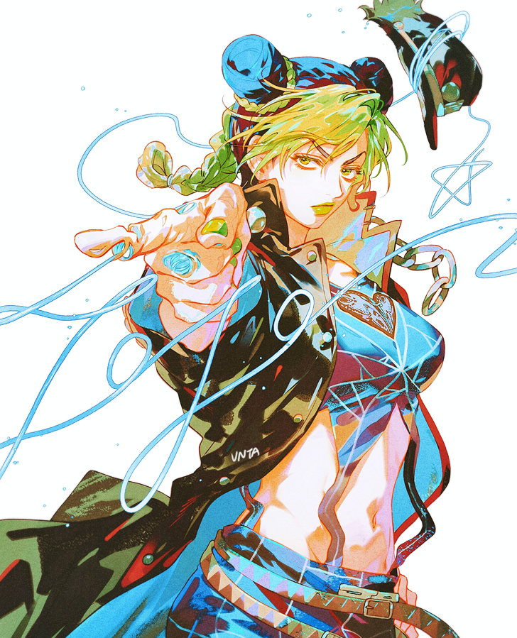 1girlblack coatblack hatblue pantsblue shirtbraidbraided ponytailbreastsbun with braided basecoatcosplaydouble bungreen eyesgreen hairgreen lipsgreen nailshair bunhatjojo posekujo jotaro (cosplay)kujo jotaro's pose (jojo)medium breastsnavelpantspointingshirtsimple backgroundsolostand (jojo)threadwhite background