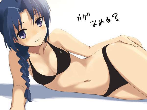 00s1girlbikiniblack bikiniblue hairbraidfemale focuslyingnavelon sidepurple eyessmilesoloswimsuit