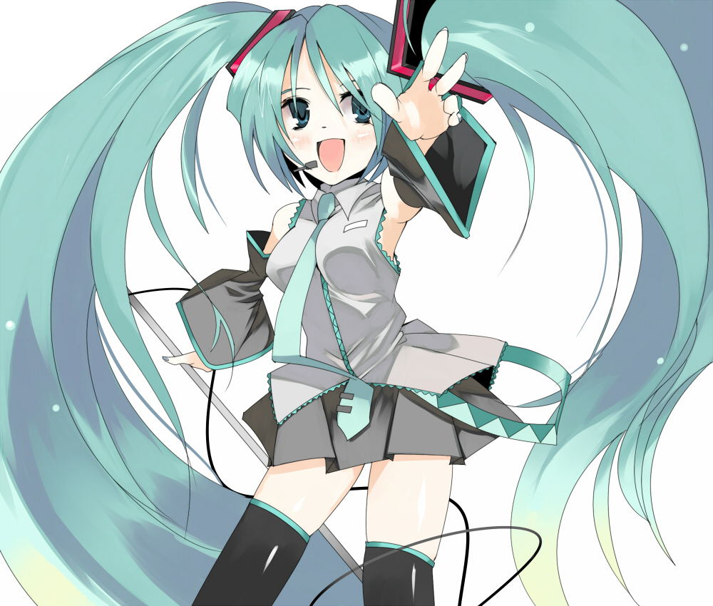 aqua eyesaqua hairdetached sleevesheadsetlong hairnecktieoutstretched armoutstretched handreachingskirtsolothighhighstwintailsvery long hair