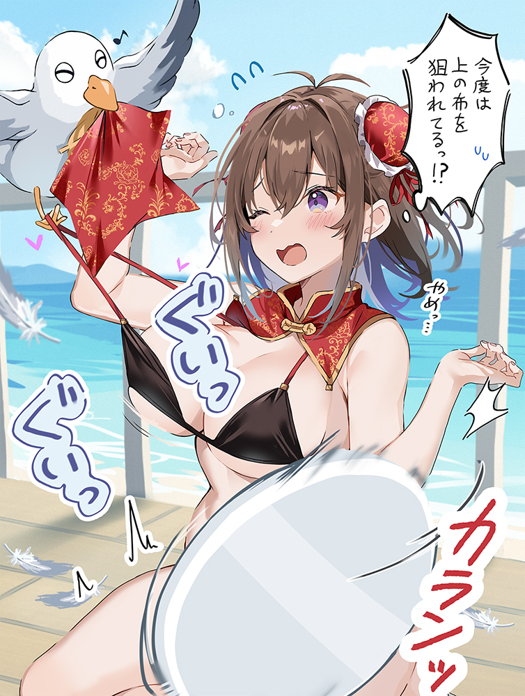 1girlbikinibirdblack bikiniblushbreastsbrown hairbun covercensoredchinese clothesconvenient censoringhair between eyeshair bunlarge breastsoceanone eye closedopen mouthoutdoorspurple eyesseagullspeech bubbleswimsuittalonstraywaterwings