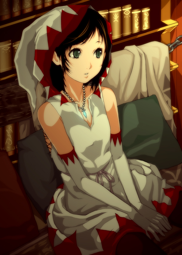 1girlblack hairbookbookshelfchainelbow glovesfemale focusflat chestglovesgreen eyeshoodjewelrynecklacepillowrobesolo