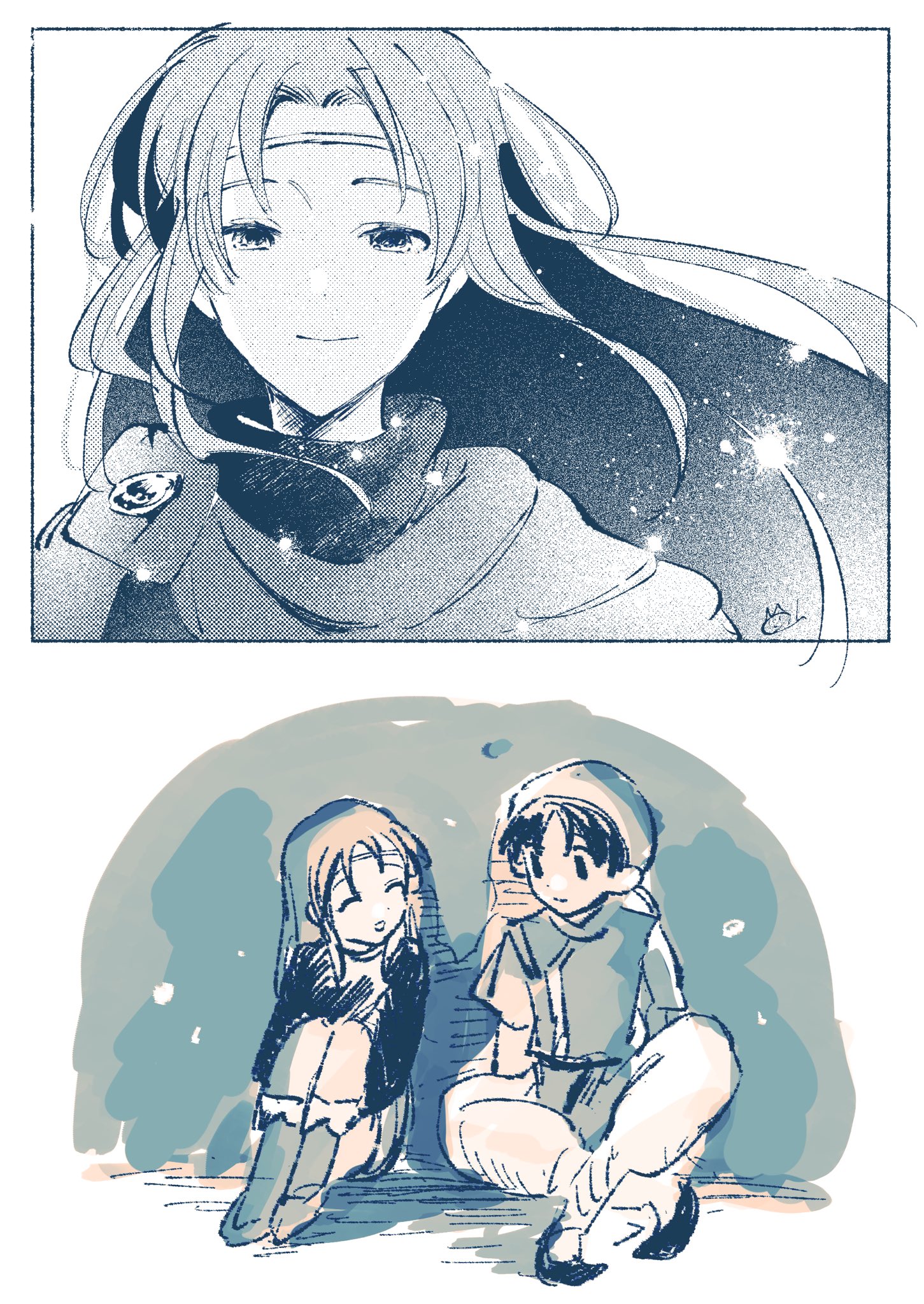 hoj duck, lune (clair obscur: expedition 33), sciel (clair obscur: expedition 33), clair obscur: expedition 33, commentary request, korean commentary, 2girls, camisole, closed eyes, kiss, long hair, medium hair, monochrome, multiple girls, ponytail, shirt, squeans, upper body, yuri