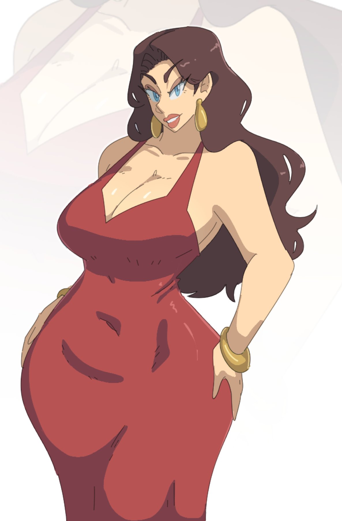 1girlbare shouldersblue eyesbraceletbreastsbrown haircleavagedressearringshand on own hiphuge breastsjewelrylarge breastslipslipsticklong dresslong hairlooking at viewermakeupred dresssolothick thighsthighs