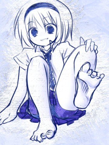 1girlbad anatomybad feetbarefootfeetfemale focusmonochromenecktiepoorly drawnshort hairskirtsolo