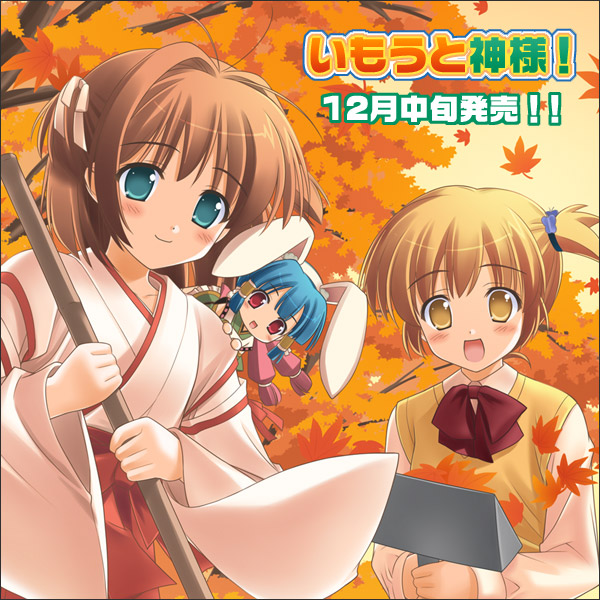 3girlsaqua eyesblue hairblushbrown hairjapanese clothesleafmikomini personminigirlmultiple girlsred eyesshort hairyellow eyes