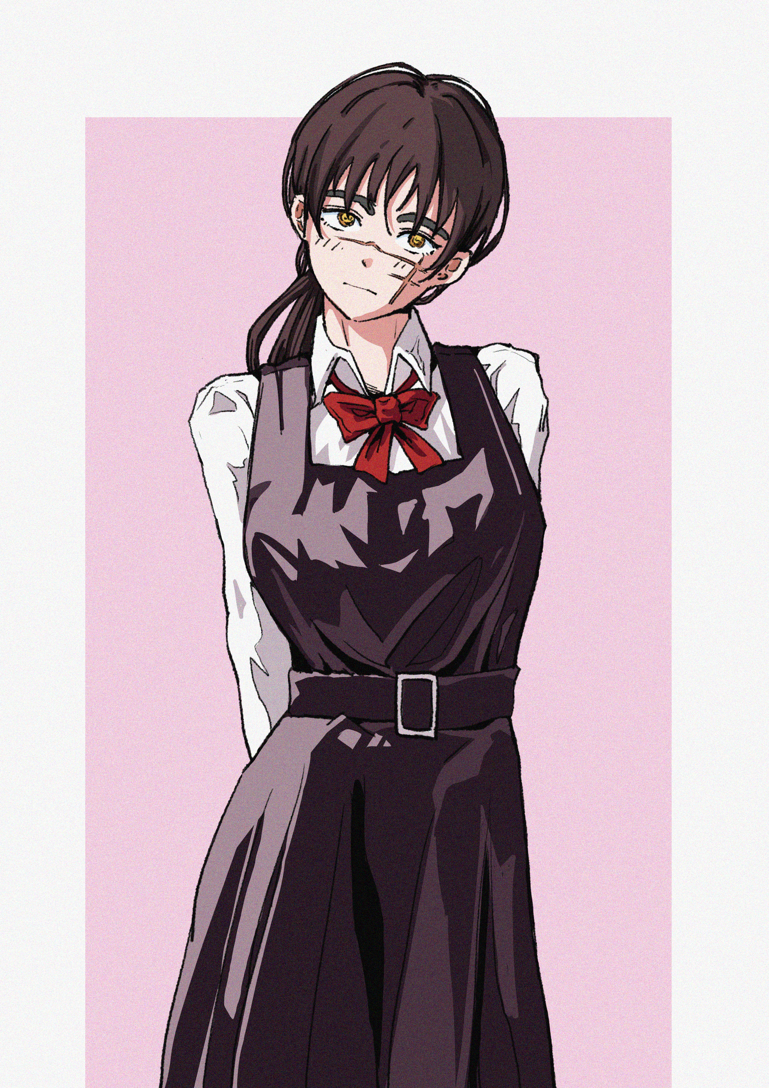 1girlarms behind backbeltblack dressblack hairblushborderbowbowtiebreastscross scardresshead tiltlooking at viewermedium breastspinafore dresspink backgroundponytailred bowred bowtiescarscar on faceschool uniformshirtsimple backgroundsleevelesssleeveless dresssolothick eyebrowswhite borderwhite shirtya sha (cgxf2334)