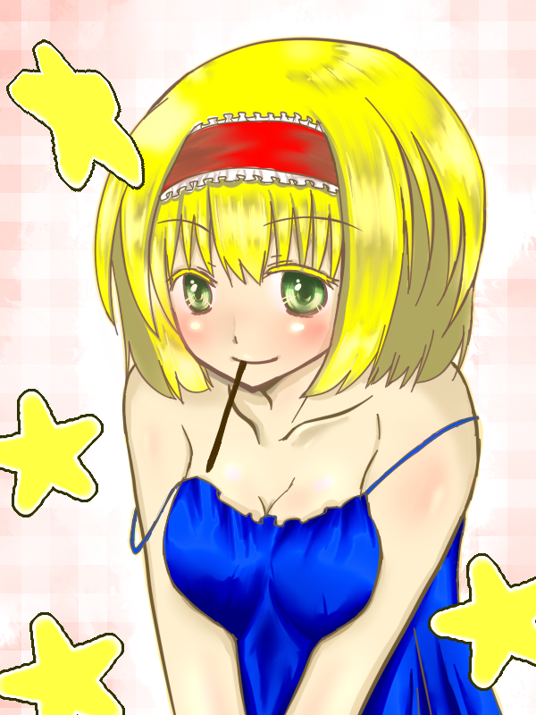 1girlbare shouldersblonde hairblushbreastscamisolechemisecleavagecollarbonefemale focusfoodfood in mouthgreen eyeshairbandlooking at viewermedium breastsmouth holdpockyshort hairsmilesolostar (symbol)strap slip