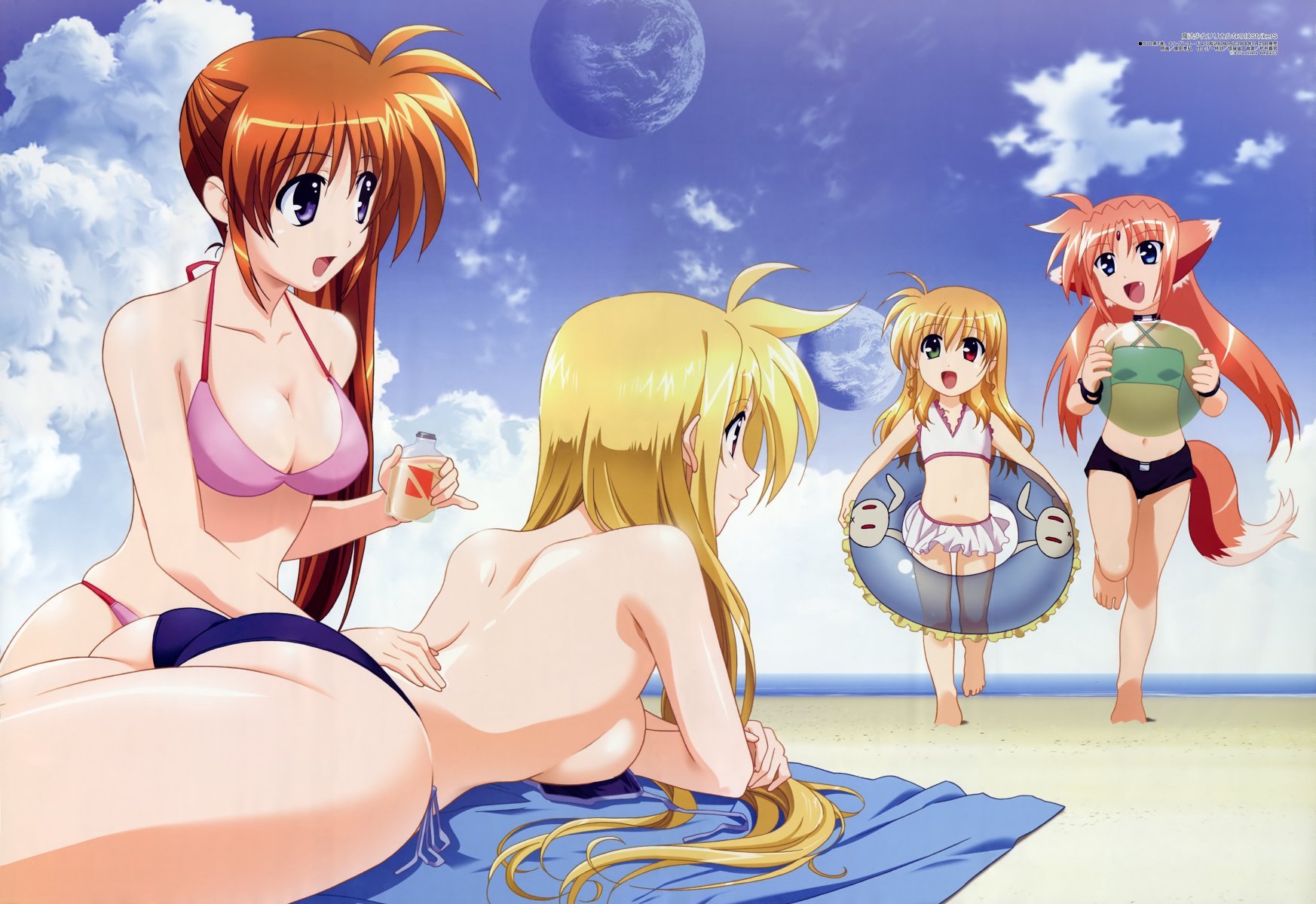 kusugawa sasara, maaryan (to heart), to heart (series), to heart 2, 00s, 2girls, bikini, blonde hair, breast rest, breasts, breasts on head, cloud, day, innertube, large breasts, long hair, multiple girls, one-piece swimsuit, pink hair, school swimsuit, side-tie bikini bottom, swim ring, swimsuit, white bikini
