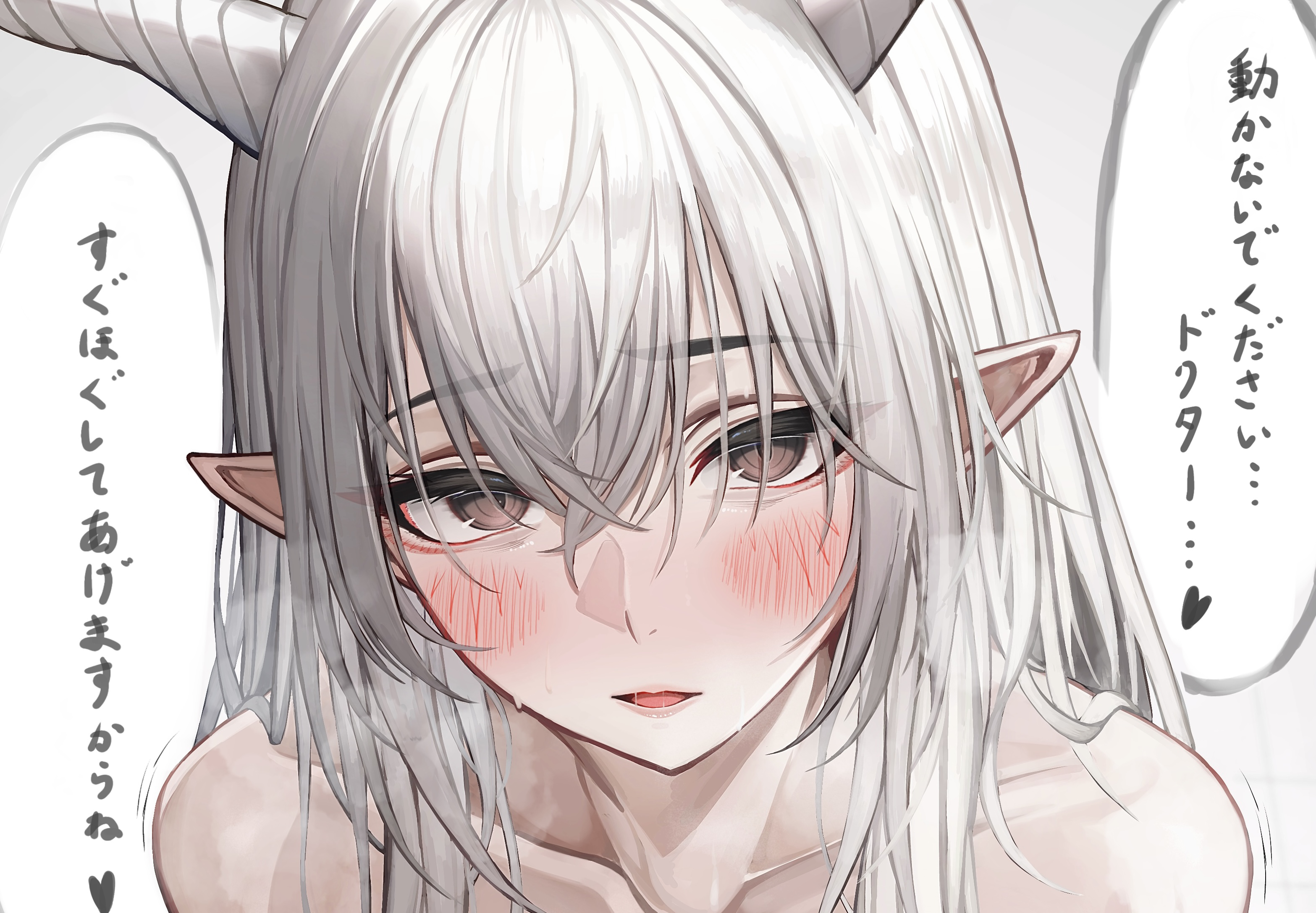 1girlblushbrown eyescollarbonehair between eyeshornslong hairlooking at vieweropen mouthpointy earssolospeech bubbleupper bodywhite hairwhite horns