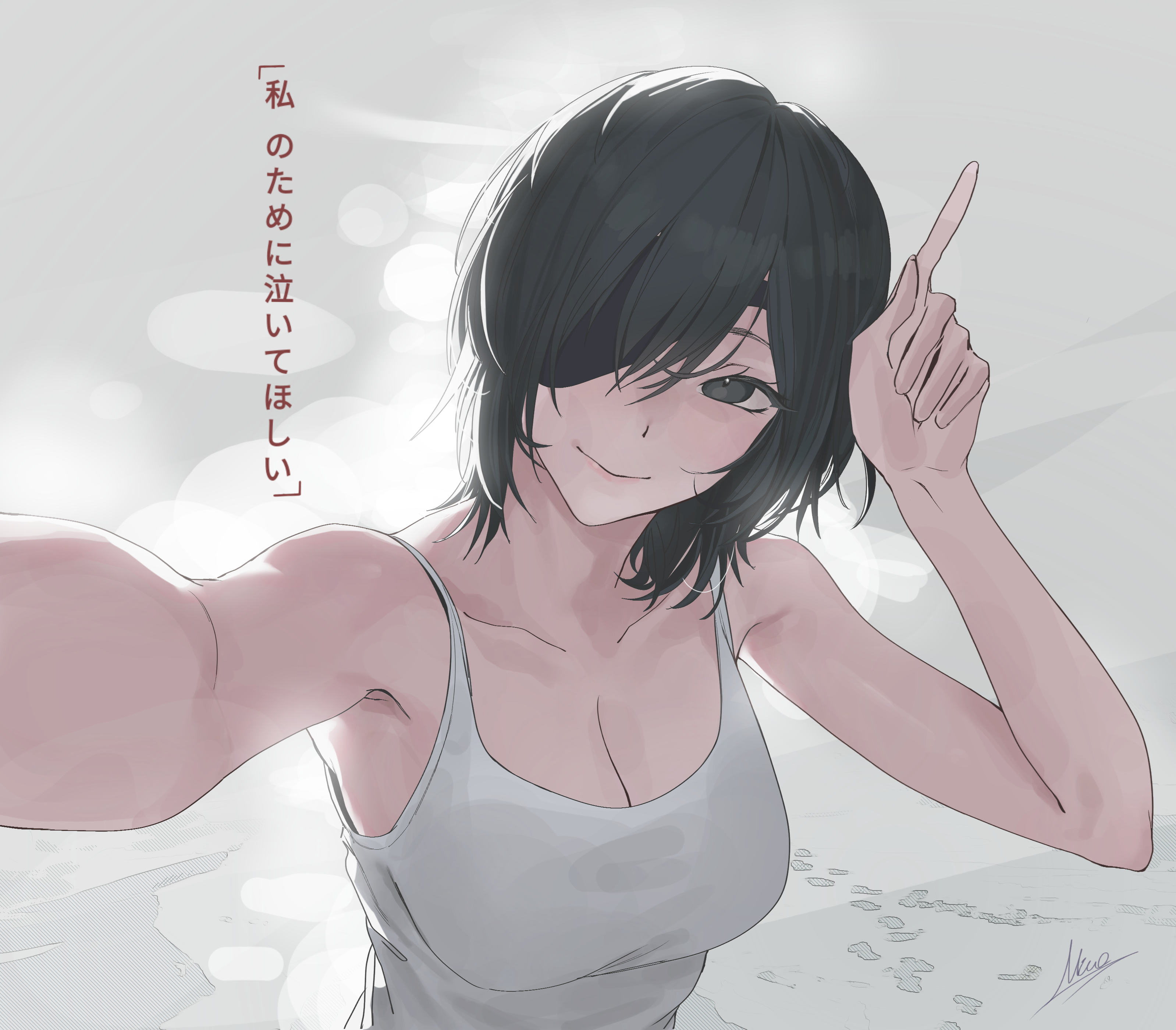 1girlarmpitsbare legsblack hairbreastscleavagecollarboneeyepatchhead tiltindex finger raisedlarge breastsselfiesmilesolotank topupper bodywhite tank top