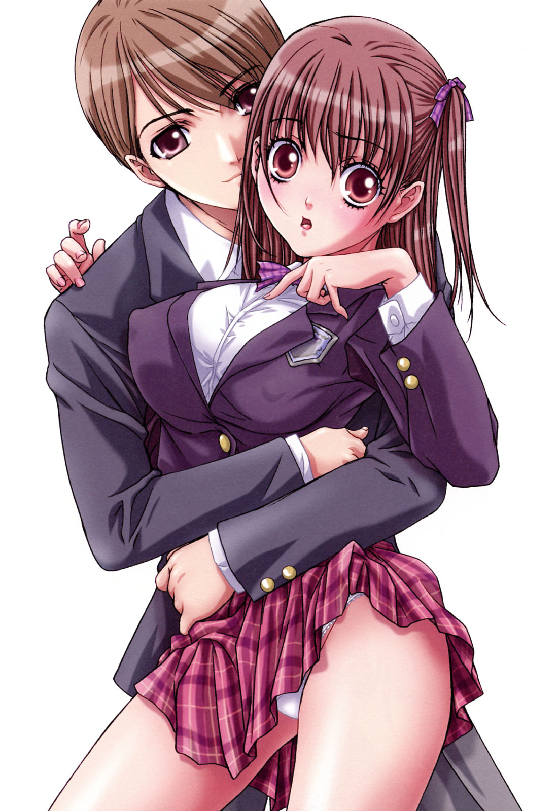 1boy1girlblazerblushbreastsbrown eyesbrown hairclingcoupleheterohugjacketlarge breastslong hairminiskirtpantiespantyshotplaid clothesplaid skirtschool uniformside ponytailskirtunderwearupskirtwhite panties