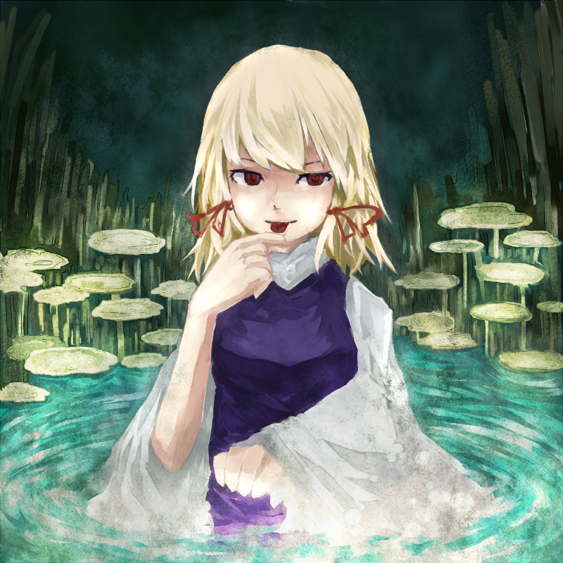 :p1girlblonde hairfemale focusgrasshand on own chinmushroomred eyesshort hairsolotonguetongue outwater