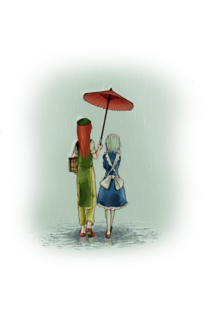 2girlsfemale focushairbandhatlong hairmultiple girlsoil-paper umbrellarainred hairribbonshort hairumbrella