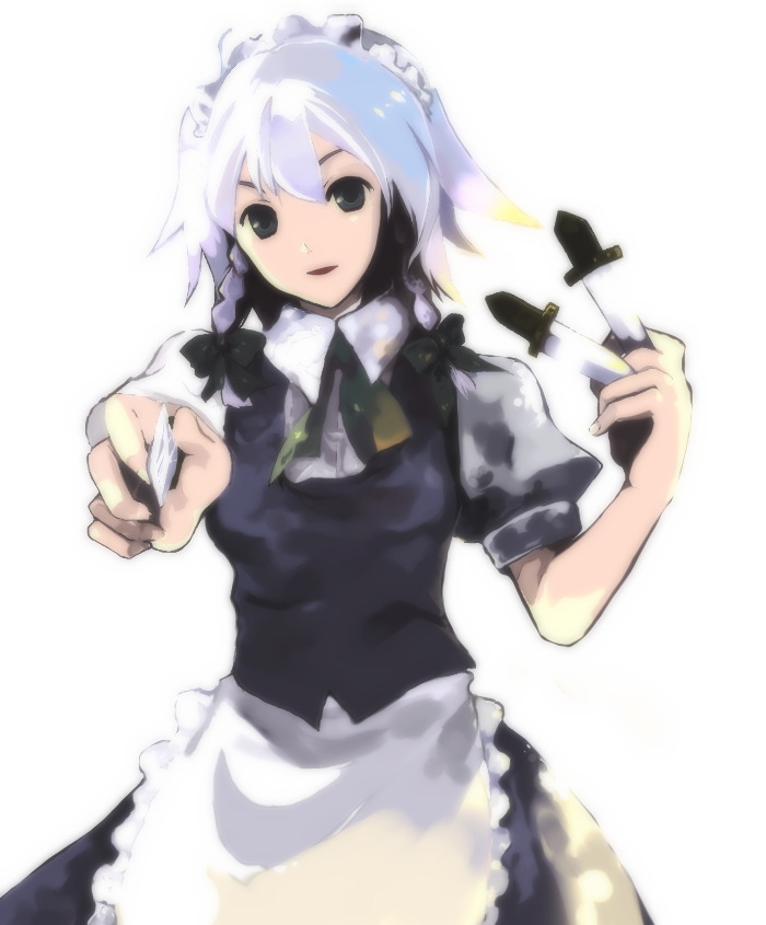 1girlbetween fingersbraidfemale focusforeshorteningholdingknifemaidshort hairsolothrowing knifetwin braidsweaponwhite hair