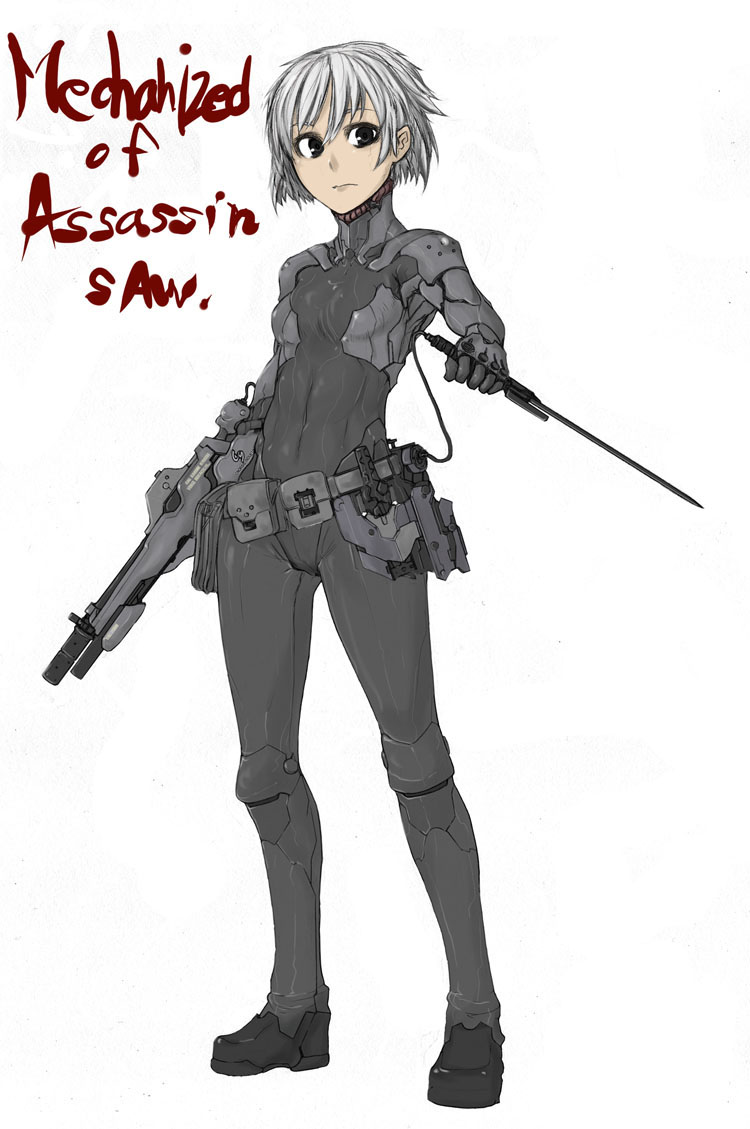 1girlblack eyesbodysuitclose-quarters combatcyborgfemale focusgunknifereverse gripshort hairsoloweapon
