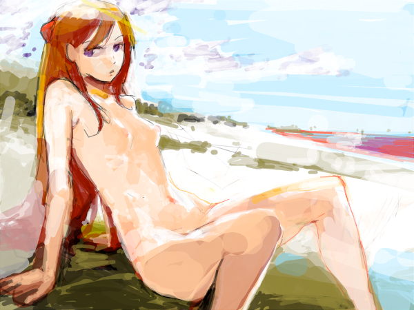 1girlarm supportbeachblue eyesbreastscloudcompletely nudedayfemale focusflat chestlong hairnavelnipplesnudenudistoceanorange hairoutdoorspublic indecencyred hairsittingskysolovery long hair