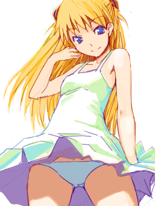 bare shouldersblonde hairblue eyesdressfrom belowhair fliplong hairlooking downoekakipantiespantyshotsmilesolounderwearwindwind lift