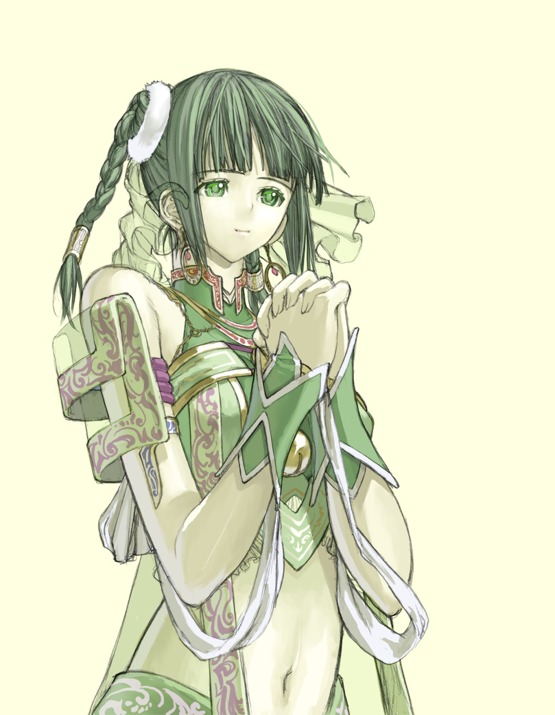 1girlblunt bangsbraidearringsfemale focusgreen eyesgreen hairjewelrylight smilematching hair/eyesmidriffnavelown hands claspedown hands togetherprayingshort hairsidelockssimple backgroundsoloupper body
