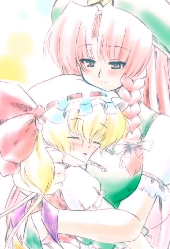 2girlsbetween breastsblushbreastscuddlingdroolingfemale focushead between breastshugmultiple girlssalivasleepingwingsyuri