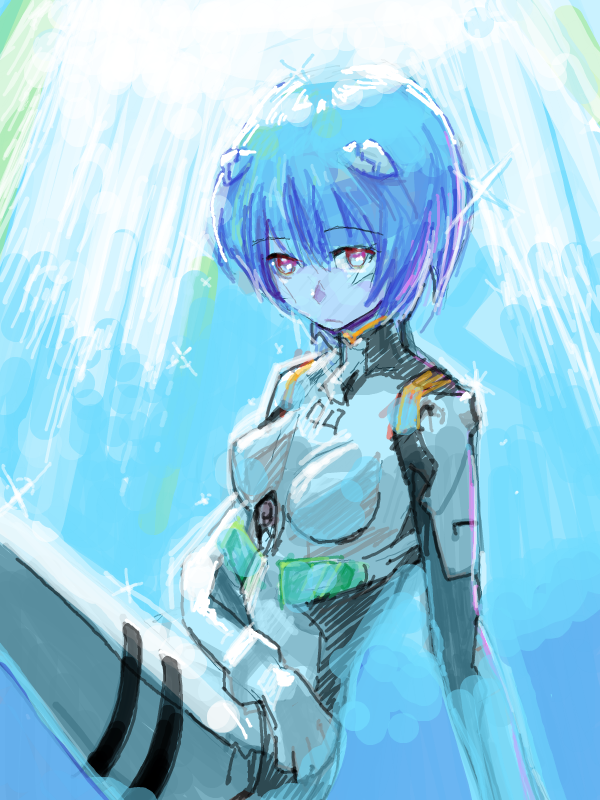 1girlblue hairfemale focuslooking at viewermecha pilot suitoekakiplugsuit (evangelion)red eyesshort hairsketchsolo