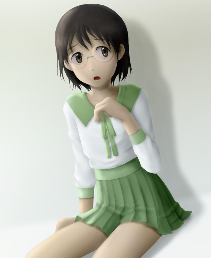 :o00s1girlblack hairbrown eyesfemale focusglassesgreen skirtlong sleeveslooking at vieweropen mouthpleated skirtrimless eyewearsailor collarschool uniformserafukushirtskirtsolowhite shirt