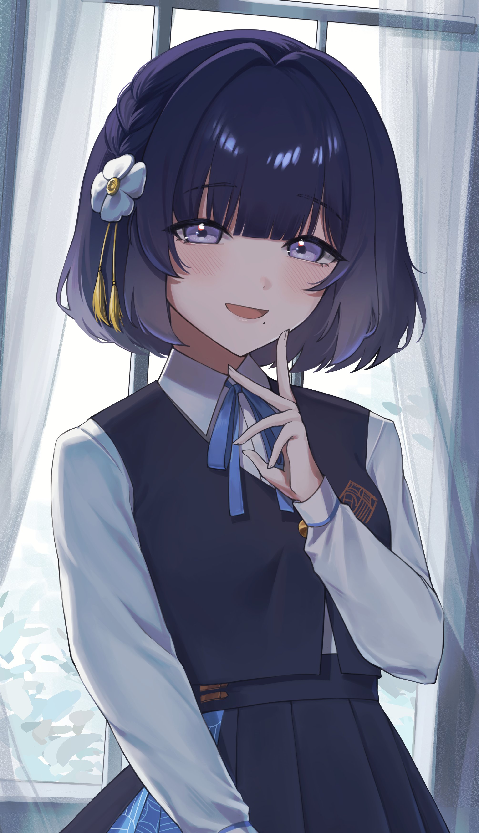 1girlblue ribbonblue skirtblue vestblushbraidcollared shirtcurtainsflowerhair flowerhair ornamenthatsuboshi gakuen school uniformlong sleeveslooking at viewermolemole under mouthneck ribbonopen mouthpleated skirtpurple eyespurple hairribbonschool uniformshirtshort hairskirtsmilesolotasseltassel hair ornamentvestwhite shirtwindow