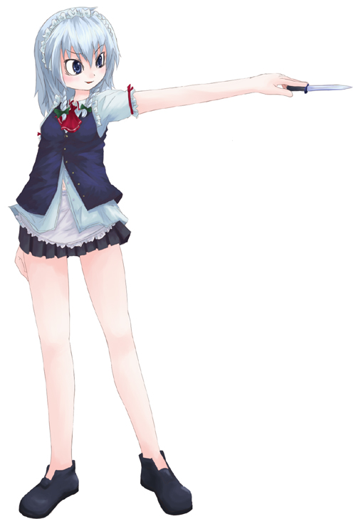 1girlblue eyesbraidfemale focusknifemaidsimple backgroundskirtsolothrowing knifeweaponwhite background