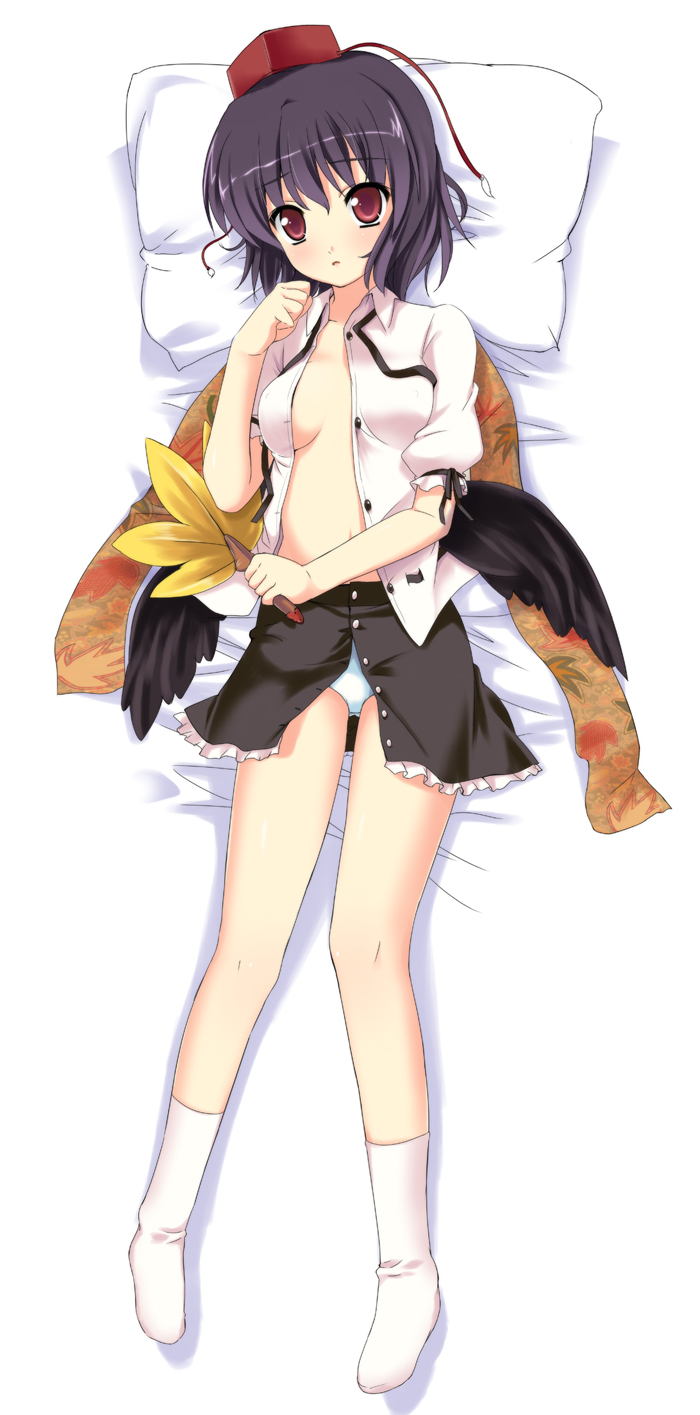 :o1girlbedblack hairblack wingsblushbreastsbreasts apartcovered erect nipplesdakimakura (medium)embarrassedfemale focusfrillsfrom abovefull bodyhand fanhatholdingleaflegslooking at viewerlyingmidriffminiskirtnavelno braon backopen clothesopen mouthopen shirtopen skirtpantiespillowred eyesribbonscarfshadowshirtshort hairshyskirtsmall breastssockssolotokin hatunbuttonedunderwearwhite pantieswhite sockswings