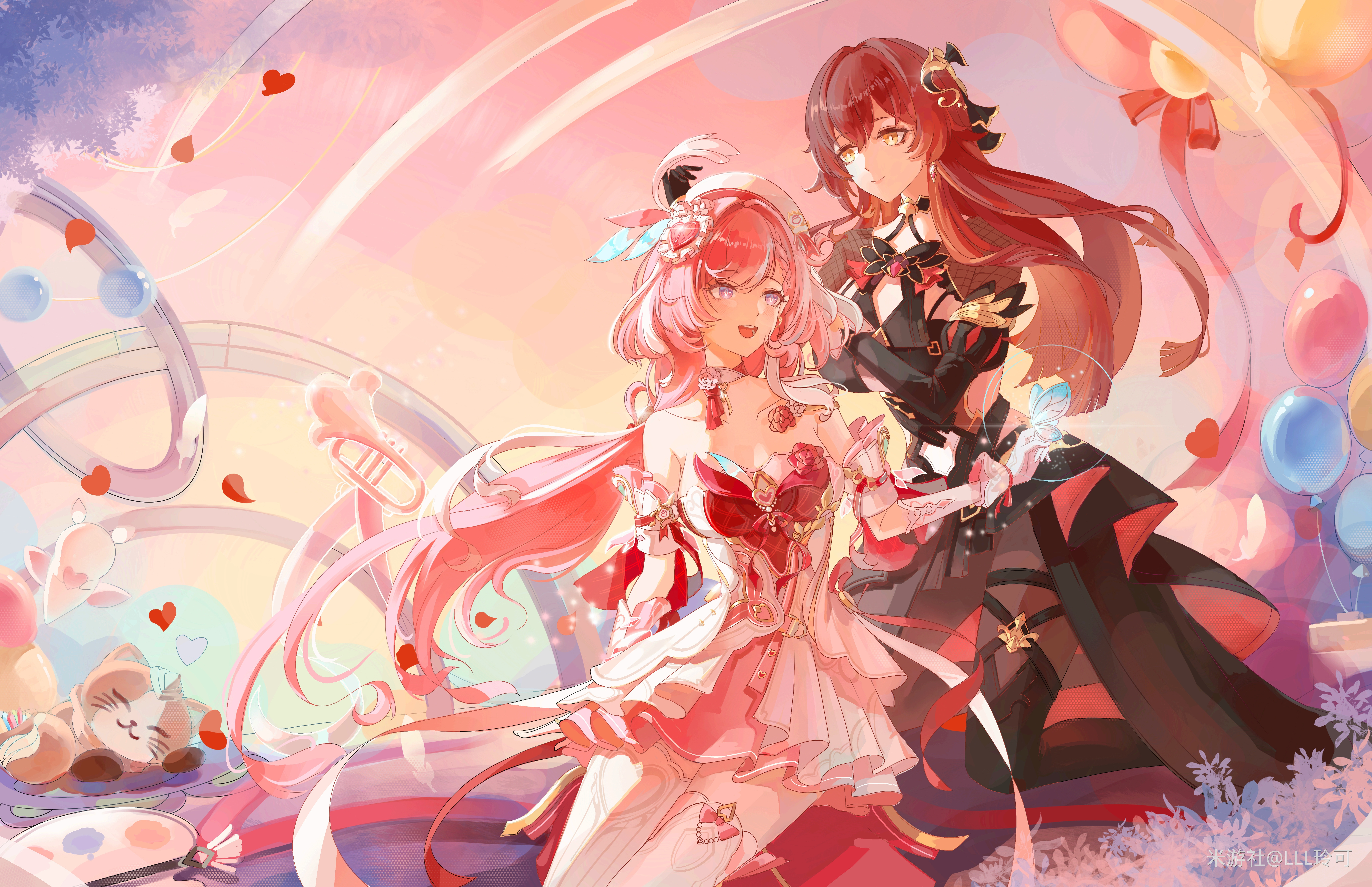 2girlsballoonbare shouldersberetblack dressblack glovesbreastsbrown haircleavagediamond (shape)diamond-shaped pupilsdressgloveshatheartinstrumentlarge breastslong hairmultiple girlspink hairpink skypurple eyesred dressskysmilesymbol-shaped pupilstrumpettwo-tone dressvery long hairwhite dressyellow eyes