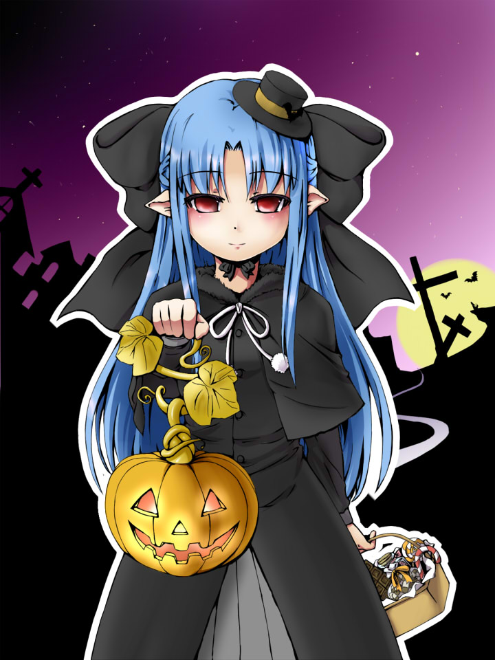 1girlbat (animal)black bowblack hatblue hairblushbowcandycapeletdressfoodfull moonhair bowhalf updohalloweenhalloween buckethatjack-o'-lanternlong hairlong sleeveslooking at viewermoonpointy earspumpkinred eyesribbonskirtsolotombstone